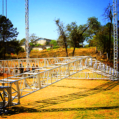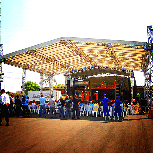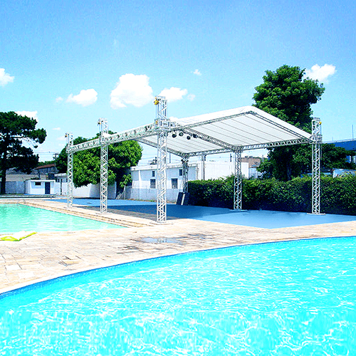 As coberturas montadas pela Petruss são constituídas de peças Box truss em alumínio, liga estrutural 6351-T6 e lona antichamas. Disponíveis na versão duas águas, permitem opção de acréscimo de fechamento lateral.